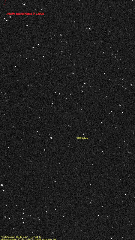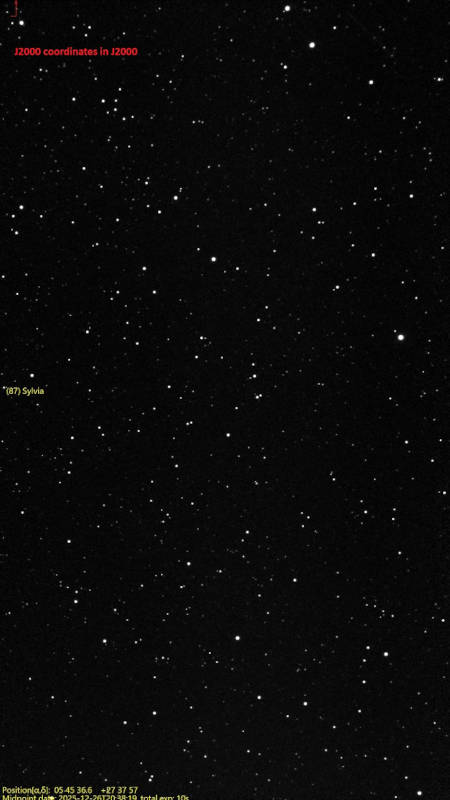 Bref, une sacrée évolution mais qui ne restera pas sans faute majeure car mes soirées du 25 et 26 décembre 2025 resteront entachées d’un bug majeur, jusque-là non vécu avec le Seestar jusqu’à la version 2.7.0 précédente, à savoir une régression manifeste en ce qui concerne le pointage d’objets personnalisés avec leurs coordonnées AD et DEC. A chaque pointage d’un astéroïde pour son tracking ou d’une étoile variable, ceux-ci se retrouvant désormais au mieux en extrême bord du champ, au pire hors-champ alors que le Seestar était reconnu comme absolument désarmant de précision avant la V3.0.0 avec des objets chirurgicalement parfaitement centrés à coup sûr, même à l’opposé sur la voûte céleste. Le 26 décembre, par souci d’en avoir le coeur net, quitte à en sacrifier grandement la production de ma séance d’observations, j’ai utilisé l’astéroïde Sylvia comme visée pour observer éventuellement l’impact que pourrait en avoir l’utilisation, tantôt de coordonnées J2000 et JNow sur la position de cet astéroïde sur la qualité du pointage du Seestar.